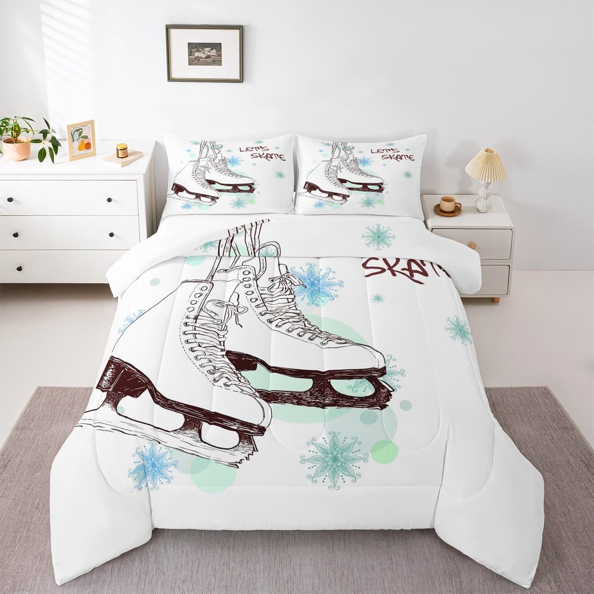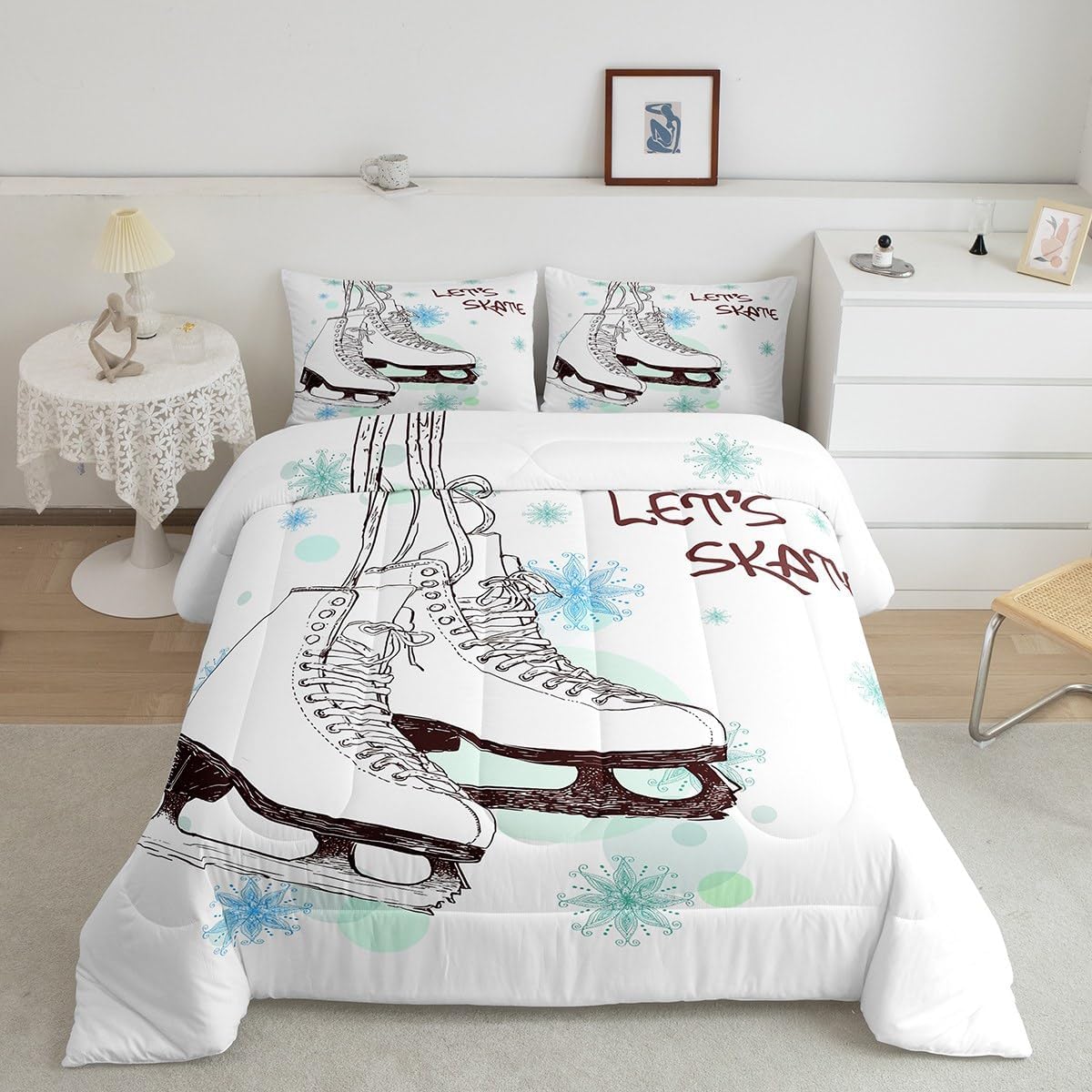 Homewish Ice Skating Comforter Set Girls Skater Skating Shoes Cartoon Bedding Set Twin Size Winter Snow Tie Dye White Quilt Set for Kids Boys Teens Room Decor Speed Sports Gaming Duvet Insert 2pcs