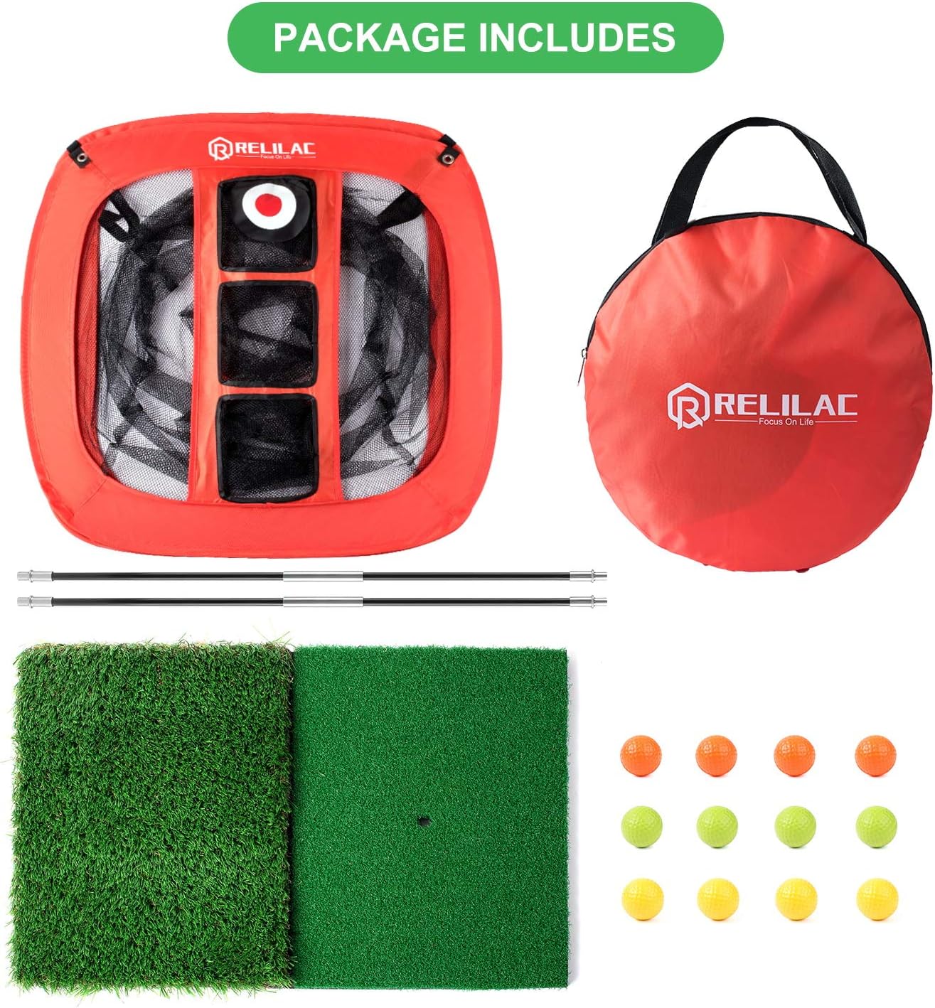 FULL CONFIGURATION – Your Relilac Golf Chipping Net Set comes with 1 chipping net, 1 dual turf hitting mat, 12 practice foam balls, and 1 removable rubber tee. Unbox and chip into action instantly, maximizing convenience and cost-efficiency.