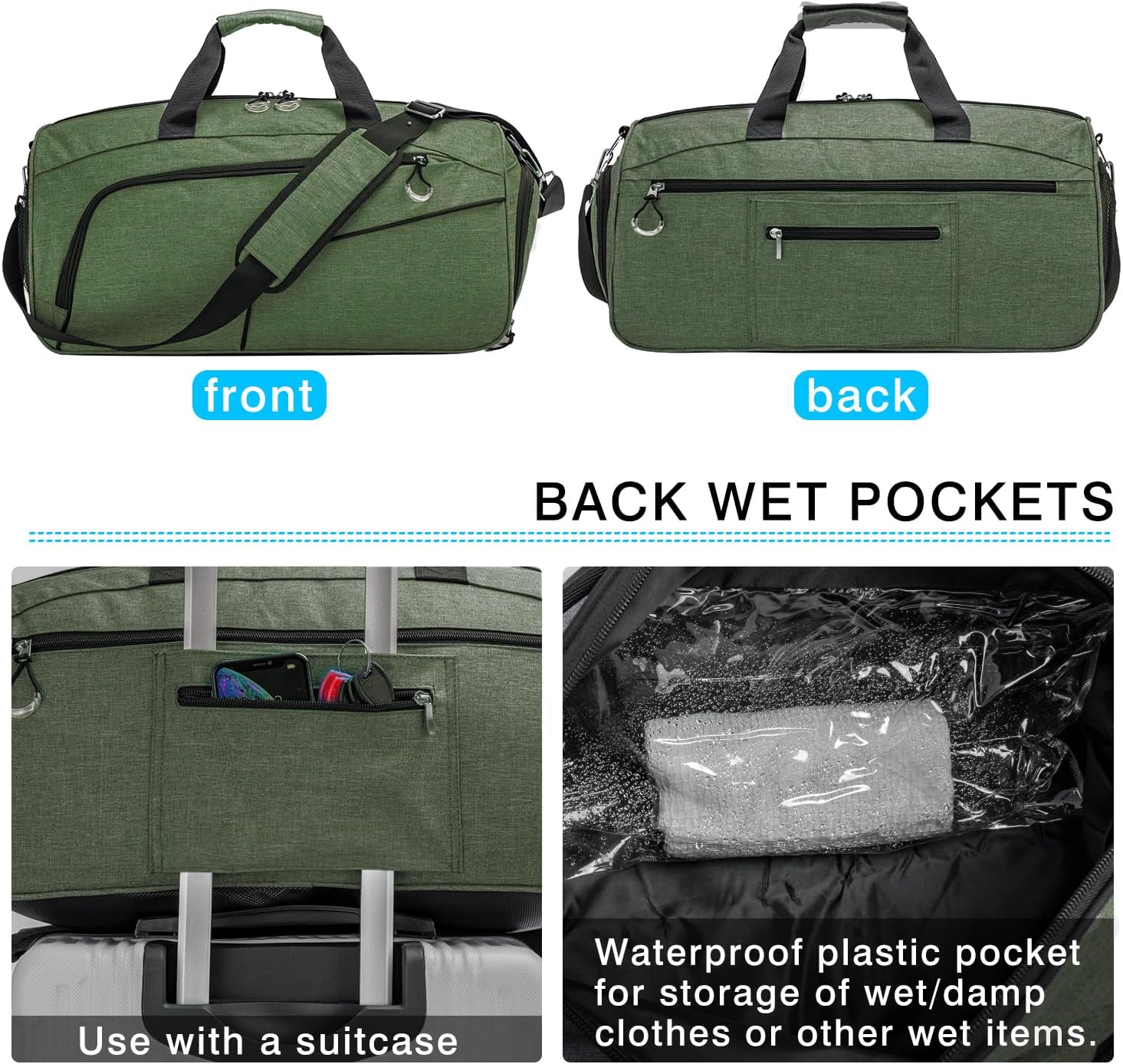 Multifunctional pockets: one main roomy compartment to keep essentials, one inner zipper pocket for your wallet and cellphone,and it features a side access shoe compartment, separating shoes or other items from the main bag.In addition,behind the duffel bag,it comes with 1 waterproof zipper pocket behind it for separating some wet clothes or towels.